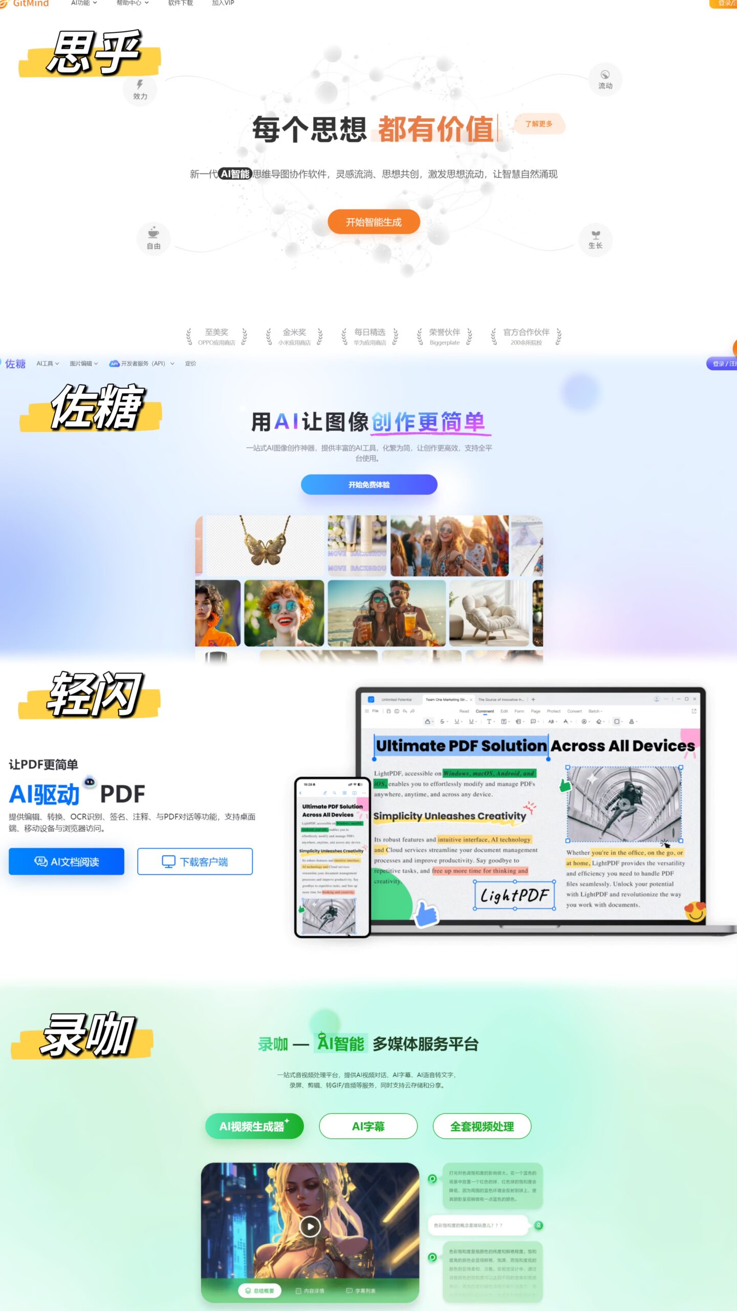 先后创立了以AI思想【思乎】为轴心,AI图像【佐糖】,AI文档【轻闪】,AI音频和AI视频【录咖】全面开花的产品矩阵,为成为全球AIGC应用场景领跑者的角色全力进攻!