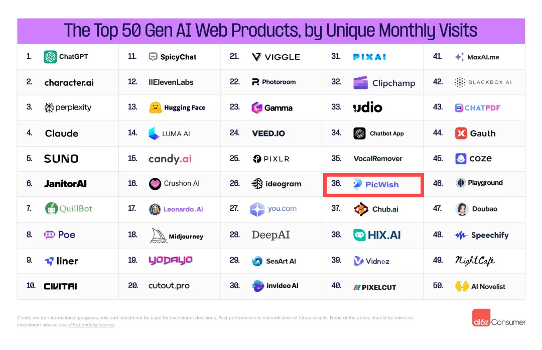 最近,硅谷顶级风投机构Andreessen Horowitz(a16Z)发布了最新的AI Top 50榜单第三版,揭示了全球范围内最具影响力的AI应用。