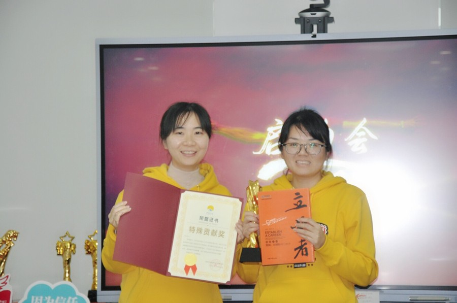 下一个奖项是特殊贡献奖,由Zoe颁发荣誉证书和书籍,获奖者是Marilyn,本季度她在软件提交工作方面做的很出色,保证了公司的所有产品都上线至各大应用商城,能持续产生销售量,给公司带来实际性的突出贡献!