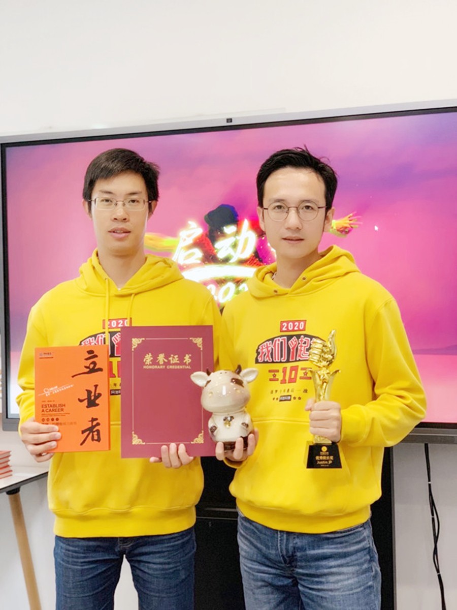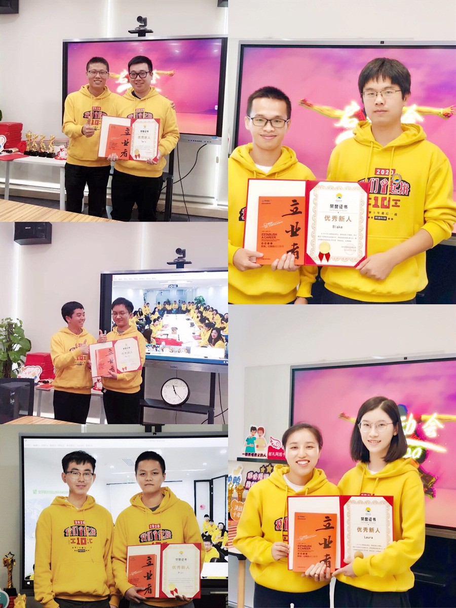 下面是年度奖颁奖环节,2019年网旭新增了47位网旭人,他们年轻优秀,为网旭注入了新鲜血液,下面就是优秀新人奖,首先公布的是Tarly、Daniel,分别由Tarly和Will为他们颁发荣誉证书和书籍;接下来公布的是Wien,由Henry颁发荣誉证书和书籍;最后两位新人是Blake和Laura,分别由Rico和Betty为他们颁发荣誉证书和贺卡!