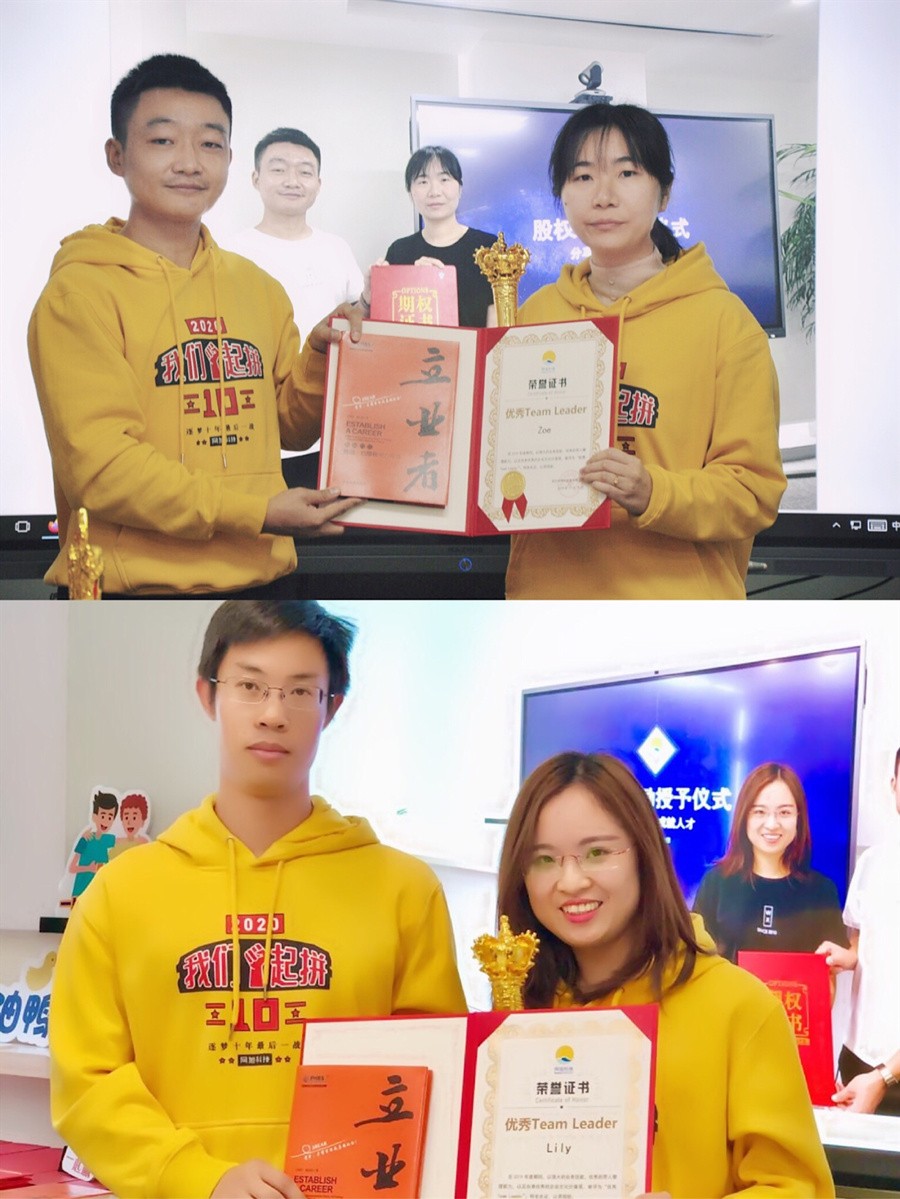 优秀新人和优秀员工离不开优秀的Leader的引导。首先请Aaron公布并颁发证书和奖杯给第一位优秀Leader--Zoe;下面由Harry公布并颁发证书和奖杯给另一位优秀Leader--lily。