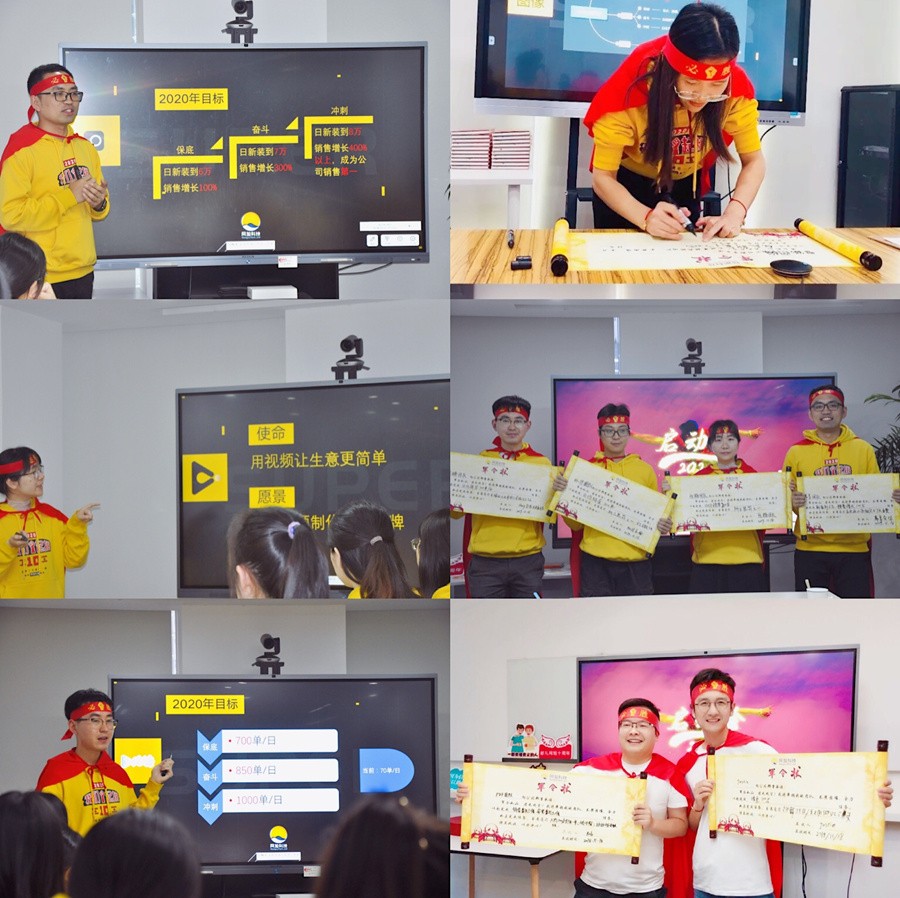 接下来是Aaron的企业目标宣讲和各PO线宣讲使命愿景价值观。PO线班长分别是右糖-Henry、幕享-Taylor、视频编辑中台-Justin、PDF-Bob、智能图像-Vicky、爱莫脑图-Casper、佐糖-Zoe,七位班长宣讲目标,奖励及惩罚,带着必胜头巾,身披红色战袍,在士气高涨的音乐中,签下军令状!