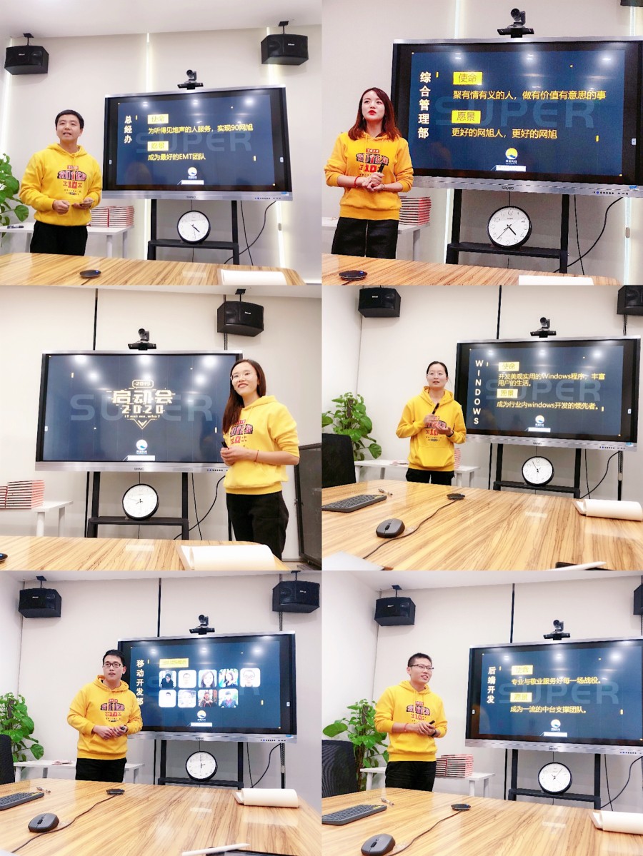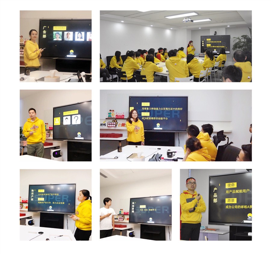 炮声打响了!接下来是职能部门讲解部门使命愿景价值观,由总经办-Will、综合管理-Lulu、创意中心-Lily、市场部-Zoe、广告-Carol、产品-Taylor、项目-Jason、前端-Rico、底层-Vicky、Windows-Rachel、移动-Joni、中台-Jim、财务知识产权-Betty为大家一一宣讲。