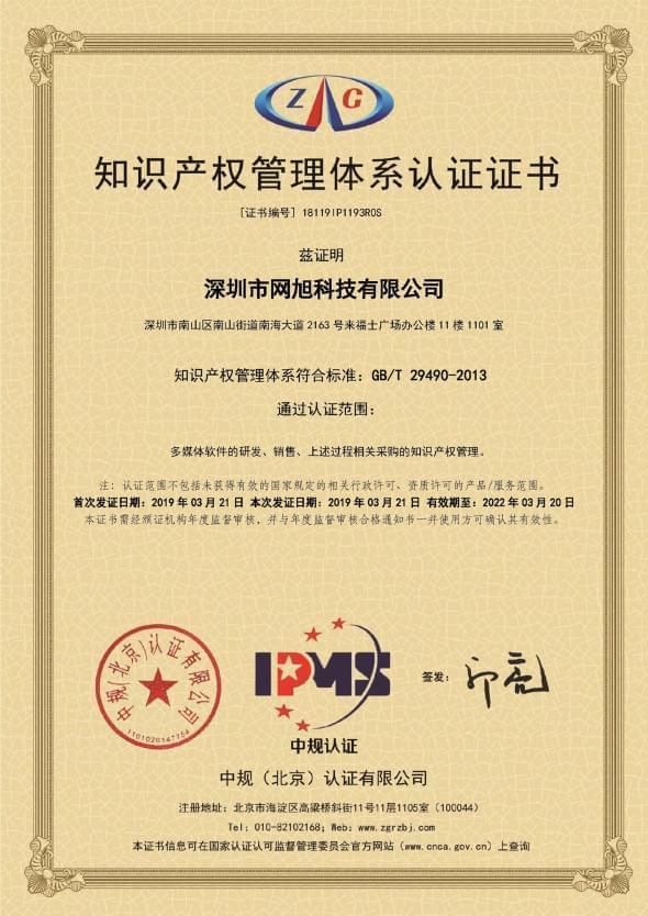 喜讯!网旭顺利通过国家知识产权管理体系认证!